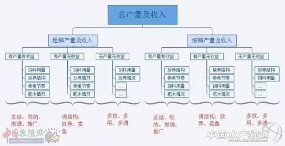 养殖一个周期,不论赚钱或亏本,都要总结经验。亏了,分析原因,看究竟是什么问题所造成的结果;赚了,总结经验,为下一轮养殖效益的提升创造条件。如2015年精养池塘通过放养不同梯度规格的草鱼和提高花白鲢的放养规格、密度的养殖户整体盈利情况都不错。当然放养模式的调整侧重点在盈利点上,只有找到盈利点上的原因才有解决的办法。如何找盈利点来调整放养模式呢?如图所示,从总产量和收入两个方面来逐一分析盈利点,在通过盈利点来调整养殖模式。